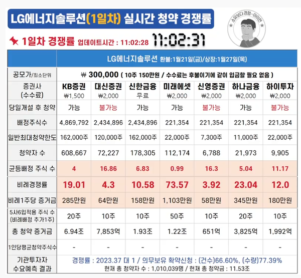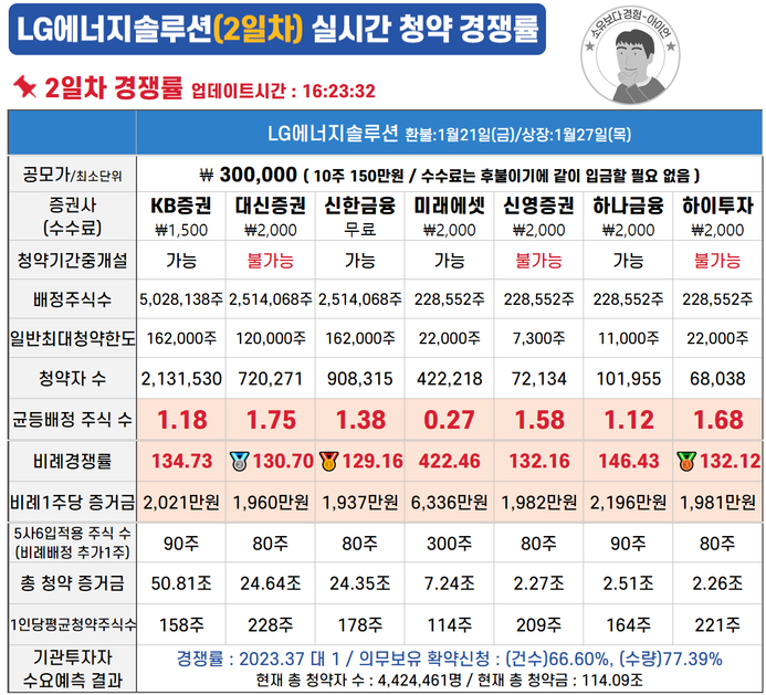 증거금은 최소 1계좌당 150만원 이상 준비한다. 경쟁률은 202337로 나타났고 공모가액은 기관투자자 모두 공모가 최고가액인 30만원을 적어냈습니다. Lg에너지솔루션 청약 경쟁률 우선 청약 첫날인 오늘 오후 1시 기준 일반 투자자 대상 청약 신청을 받는 7개 기관에 몰린 자금은 21조 원이 넘는다.